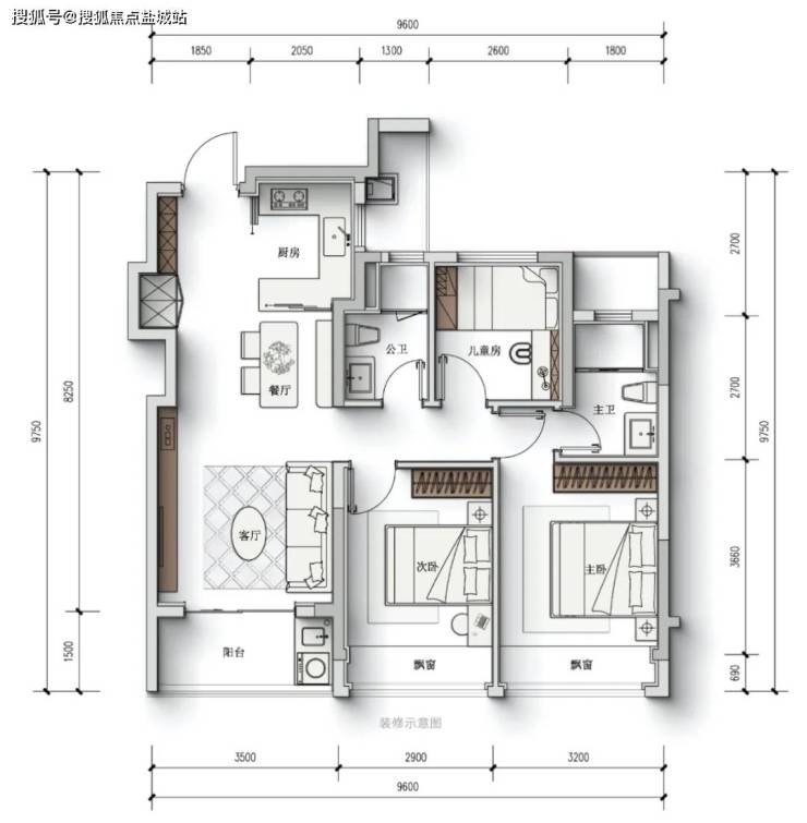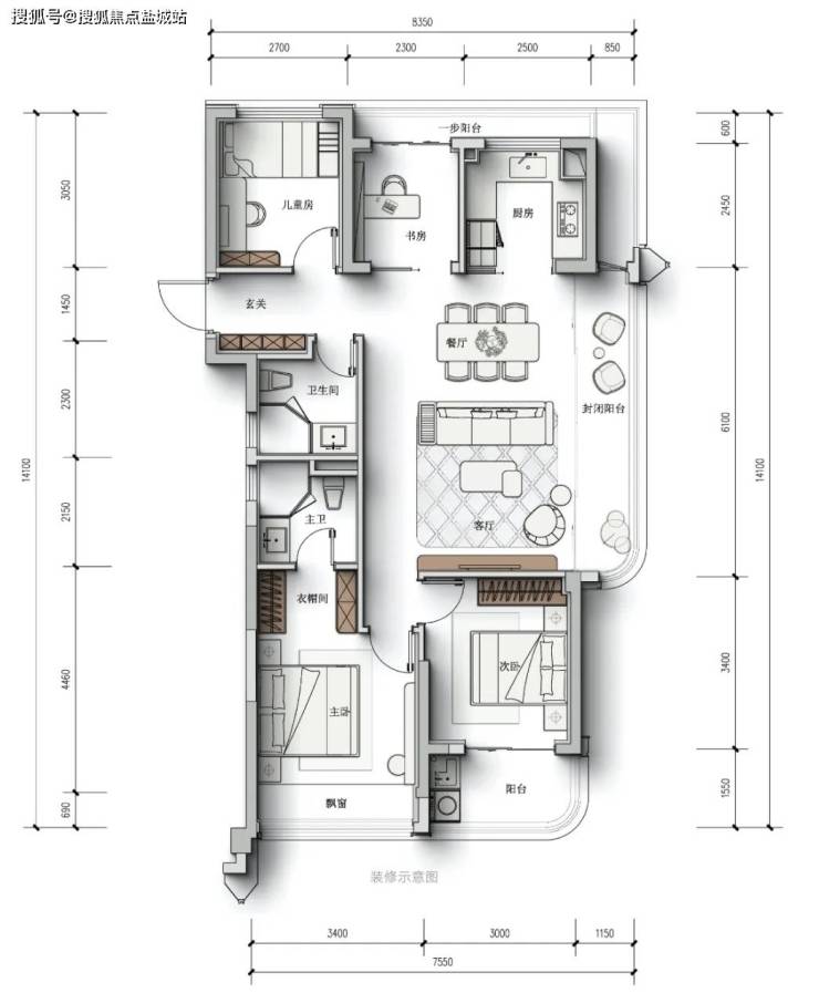 建面约112㎡四房,罕见三阳台设计,LDKB一体化 + 270°环幕视野,直接对标市面125㎡ + 户型。