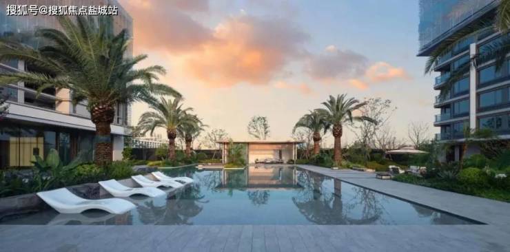 约2000㎡镜面摩登水院热带泳池,搭配加拿利海枣树阵、风雨连廊,让你下楼就能享受巴厘岛式的度假体验。