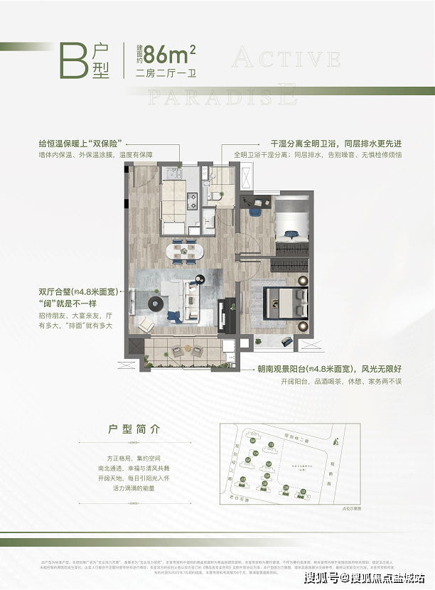 约86㎡两房,全明户型设计,空间可观,南北通透,尺度开阔。