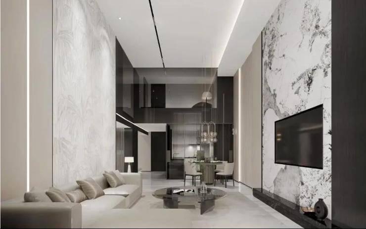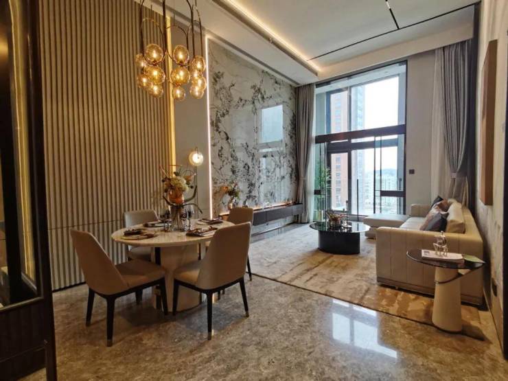 园区的内部配套齐全且高端,配备有地下会所、恒温泳池、健身房等,并且采用人车分流管理。走进房间内部,第一眼就令人惊叹的,是高达4.79米层高。这样的大层高,最能营造出空间上的奢阔感。不仅如此,据置业顾问介绍,他们在118㎡的户型上还做了错层,客厅4.2米,房间5.4米,堪称神仙设计。