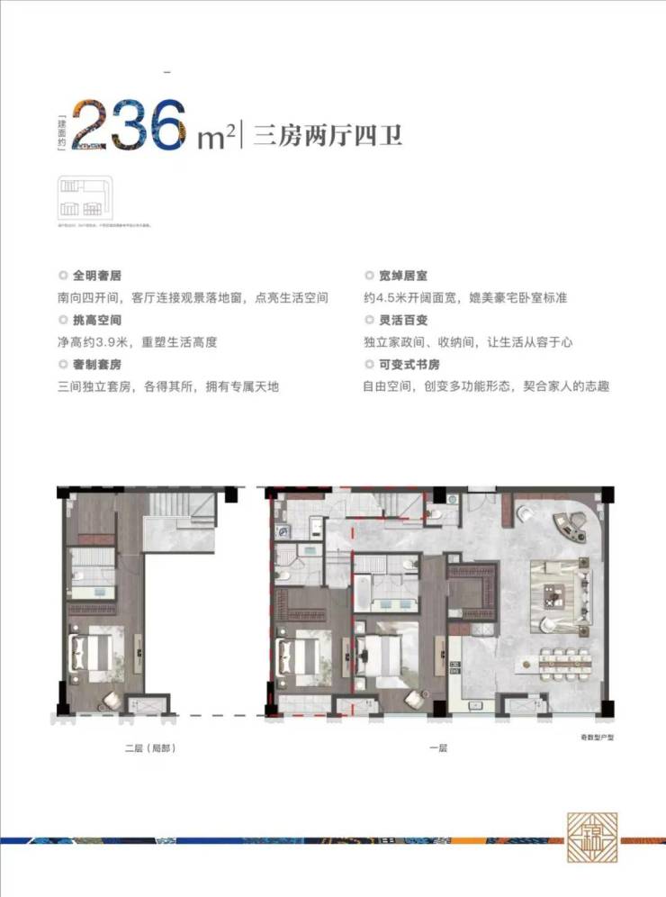 项目基本信息,户型:118方、230方、270方,类型:平层、跃层,118方跃层5.3米,客厅层高为4.79米,设计三房两厅两卫,总价约600万起。236㎡为错层,局部层高为5.3米,客厅净高3.9米,设计为三房两厅四卫总价1200万左右。272方为平层,层高为4.79米,净层高为3.9米纯边套设计,总价约1400万起。