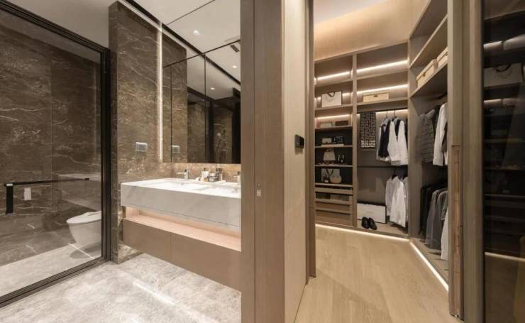 南向主卧套房,子母双开门设计,设置独立的衣帽间,与卧室隔而不断,既实用又方便。主卧的明卫设计在同类型产品中也是罕见的。次卧套房配置了独立的洗漱间,格局方正宽敞,透明玻璃墙的设计也使得整个房间既通透又通风!