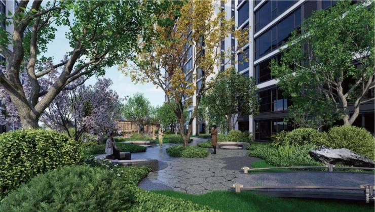 项目以开放姿态对话城市界面,通过转角花园与绿带公园的设计,自然衔接保丰河风景带,让社区融于城市绿色肌理。
