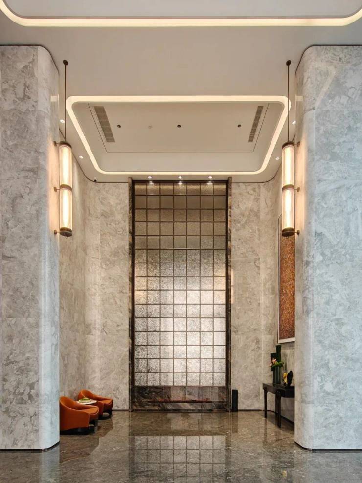 似乎想要把品质感“武装到牙齿”,地上地下双入户大堂内部的墙面摈弃了传统的涂料,大面积采用了明亮且纹理丰富的灰色石材,搭配独特纹理的威尼斯棕石材,全方位营造出尊贵典雅的空间氛围。