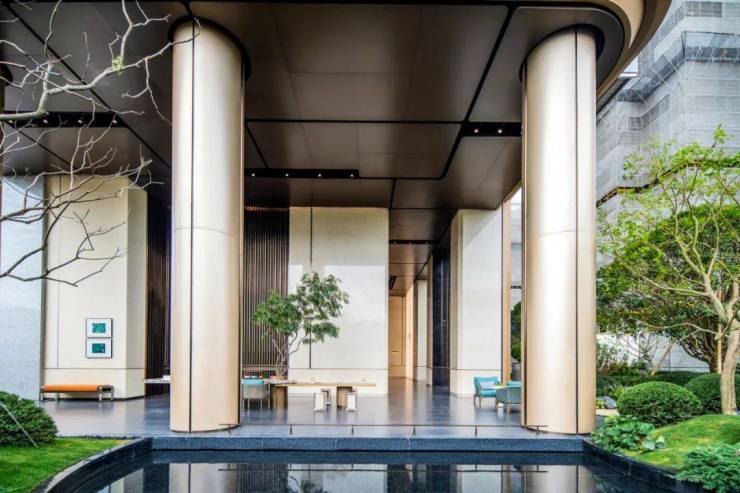 而相对于公式化的公建外立面,逸庐的外立面更加有层次、有温度:甄选米白色铝板,结合暗金、香槟金及浅金等多种不同层次的金色铝板,再加上灰色low-E玻璃,冷暖配色碰撞,独具辨识度。
