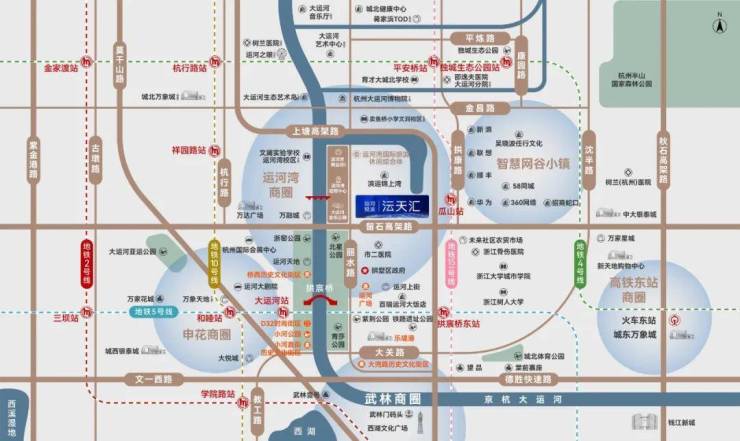【交通立体纵横】:紧邻留石、上塘等高架主干道,水上巴士贯通运河脉络,高效连接杭州东站与萧山机场,商务出行从容高效;地铁5号线及15号线(规划中)环绕,周边多路公交覆盖,无车通勤便捷。