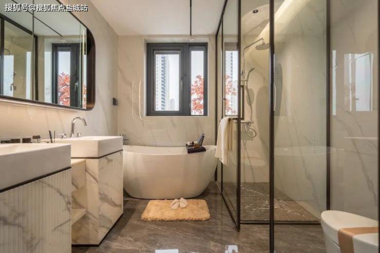 当然还有超级主卧体系。主卧面宽超大,留有浴缸、双台盆、衣帽间等区域,再配约7x2m假日阳台,单是这几项配置让很多叠墅相形见绌,无论是采光通风还是空间的尺度,都无可挑剔。