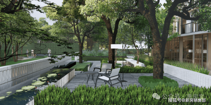 通过对光线、水系以及各种植物的运用,给业主创造了静谧、舒适的林下空间。
