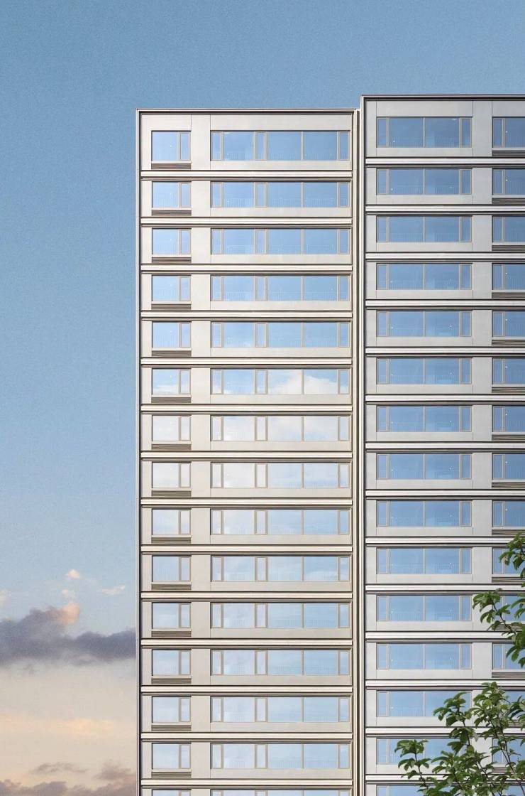 沿东升西路向西,一片住宅区映入眼帘,绿城·锦玉园17栋建筑凭借超高窗墙比脱颖而出,大面积蓝灰色low-e玻璃搭配高级灰纤细金属线条,建筑美感与质感兼具。