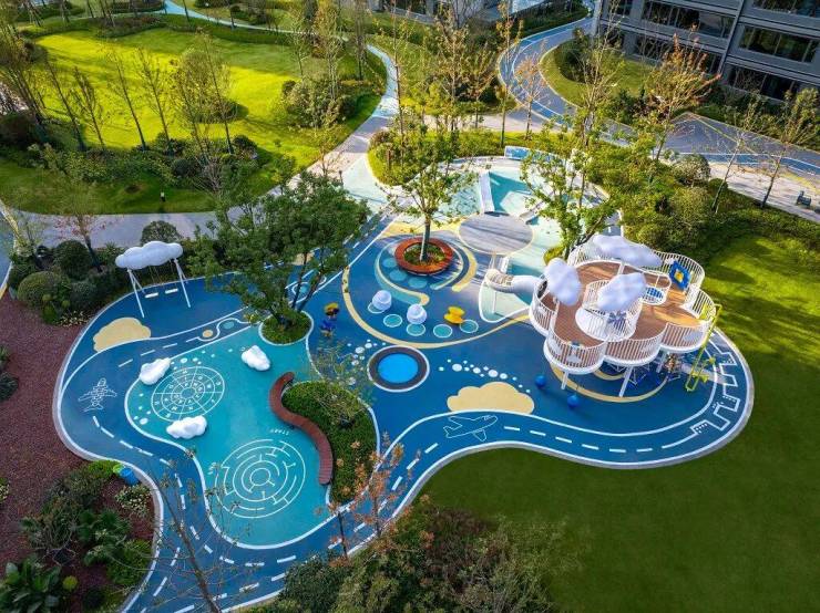 而约730㎡的 “蒂芙尼蓝”镜面泳池+偌大的星空主题游乐园,无疑是这幅生态画卷的两大视觉焦点。