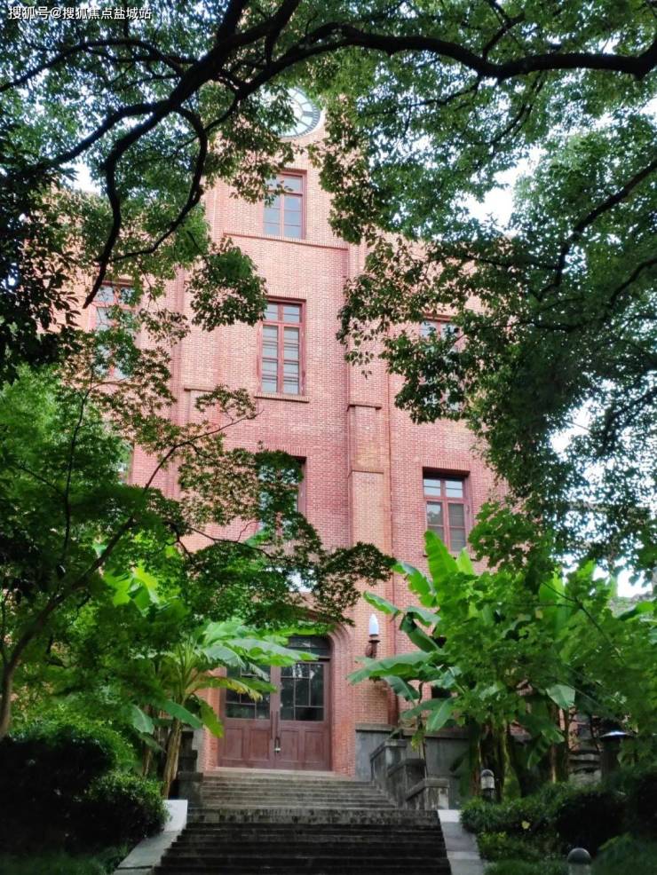 进入大门,首先闯入视野的是一棵大香樟树,繁茂的枝叶彰显着这个学校悠远的历史。沿台阶往上走,首先到达的是钟楼,穿过钟楼,就是一个小花园和大片绿树遮盖下的主楼,拱形的门窗、门前的石柱,明显的西洋风格。