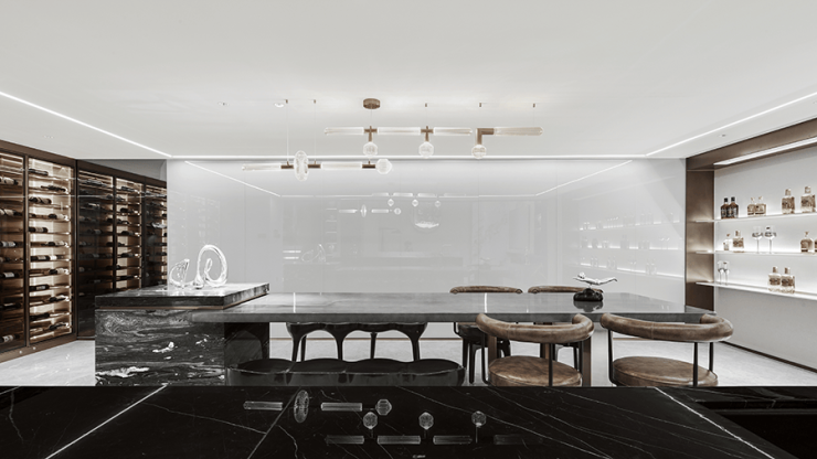 穿过岛台 另一侧是品酒室,大面积玻璃与石材细腻的纹路相结合,在起承转合间能够捕捉到,彼此细腻的纹理与形态,金属与皮质的加入加强了空间层次,沉浸酒香 闲适随性!透过视觉感官 激发内在能量,利用自然之韵,唤起人们对居住形态的迭代需求,德信浮山云湖印在沉稳中追逐未来,探索当代人居的更多可能!