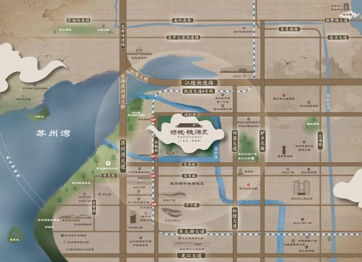 项目择址于苏州湾万公堤旁,坐拥吴江太湖新城难以复制的主城贵脉之上,打造约1.05容积率全新低密人居住区,汇集商业、教育、文化、生态资源等高品质生活圈,成为苏州塔尖人物共同的理想人居。