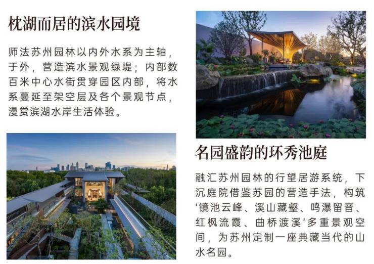 依凭半岛三面水岸的天然资源,以“一堤三面湖”和“水街襟两园”设计笔触,实现滨水互动、开门见水的场景体验;融汇吴门画派、苏州园林造园理念,营造出一座温润如玉的流动庭园。