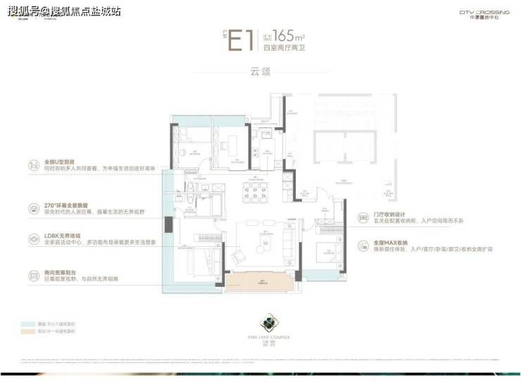 最后一个,也是非常王炸的宽奢四房户型了,建面约165㎡的四房两厅两卫。