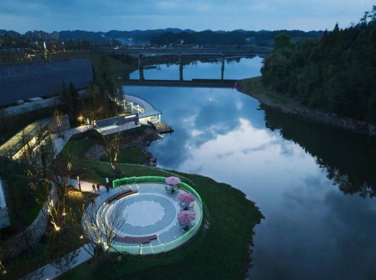 夜幕笼罩的黎香湖,多了几分静谧,缓缓而行,转角精致的水景墙和绿篱错落结合,带来视觉上的艺术之美的享受;灯光下闪耀波光的潺潺流水,带来亲近自然的疗愈能量,白日都市的喧嚣、疲累、烦躁轻易被抚平,内心也随之平和安宁。