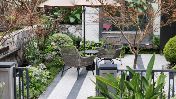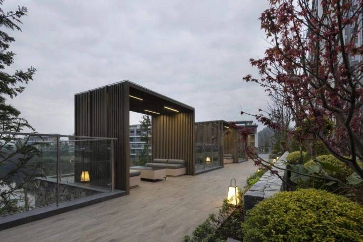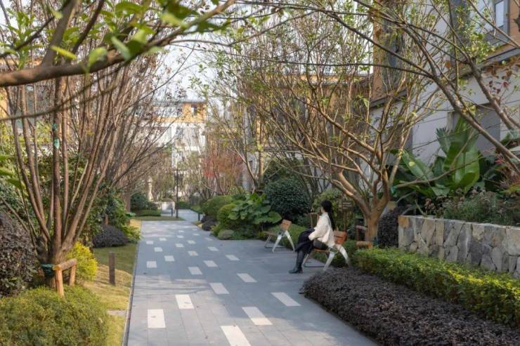 巷道两侧乔木树阵映衬、低矮灌木序列丛生,形成开敞的林下休闲空间。枝繁叶茂时,洋溢着蓬勃盎然的生命力,置身此处,呼吸间心情全然放松。宅间绿岛种植各色树种,阳光倾泄,投下一片婆娑树影,营造出自然森林的氛围,形成一个个会呼吸的自然艺术展厅,承载轻松愉悦的度假生活。