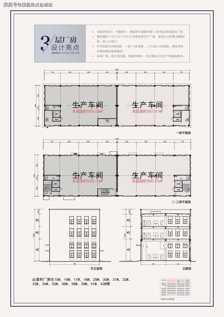 三层厂房:一层高7.9米,二层、三层高4.5米,预留牛腿,可安装 5t 电动单梁吊车