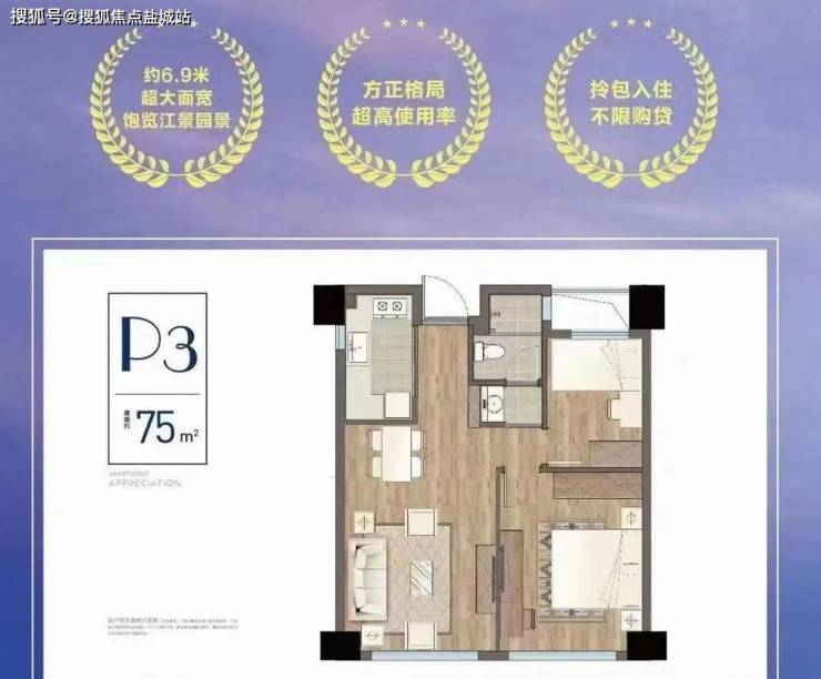 每一个户型都凝聚了开放商的匠心巧思。99㎡户型做到了三开间朝南的黄金格局,9.7m超大瞰景面宽。每个清晨被阳光叫醒,江风穿堂而入,满满的幸福感。