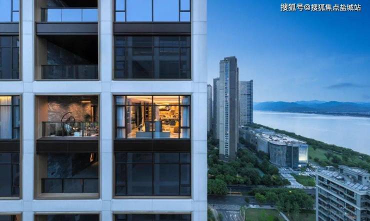 建筑以“金镶玉”为灵感,白色铝板镶嵌香槟金窗框,搭配LOW-E双层中空玻璃幕墙,形成油画框般的立面美学。每户标配约40㎡U型空中花园,可定制私人泳池、森系庭院或星空酒廊,270°全景落地窗将钱江潮涌、西湖群山与城市灯火尽收眼底。