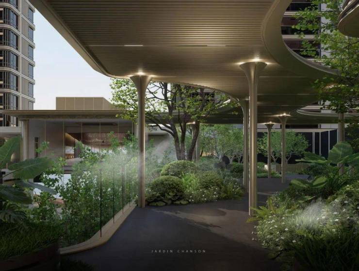 以“浮岛”为核心概念,通过“林岛漫步-循水归岸-闲庭雅致”三重动线,将浦江水岸的奔涌韵律与郊野公园的森氧秘境凝练为可触摸的生态艺术。内部部分风雨连廊连接社区与会所,雨天无需撑伞即可漫步至单元门,细节处尽显奢贵,赋予归家仪式感。