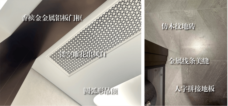 还打造了海派雕花出风口、卧室地面鱼骨拼接、卫生间地面复古拼花、香槟金金属铝板门框、金属踢脚线等元素,整个海派美学居住空间精致有腔调~