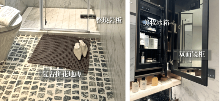 卫生间臻选普拉达绿、雅士白、雪花白、宝格丽紫奢石,纹样大气,品位素颜,展现恒久的气质。同时臻选的海派美学金属镜柜,嵌入美妆冰箱,以精微的细节,演绎矜贵的格调。