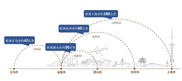 长三角1.5小时都市经济圈核心城市,杭金双核都市经济圈,约19分钟可抵达杭州、约14分钟可抵达义乌。