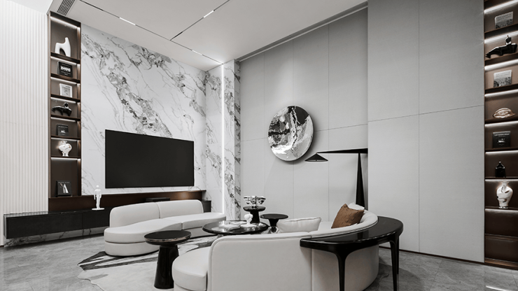 客厅在多重材质的组合下,顺畅融汇 秩序井然素雅的基调来自比例的精准把控和色彩的考究搭配,克制之间彰显出游刃有余的平衡之道!电视背景墙利用石材自身纹理,将水光潋滟的迷人景象引入室内,沙发后方的展示柜高低错落线条置于其上,玻璃和金属交融出迷濛光影!