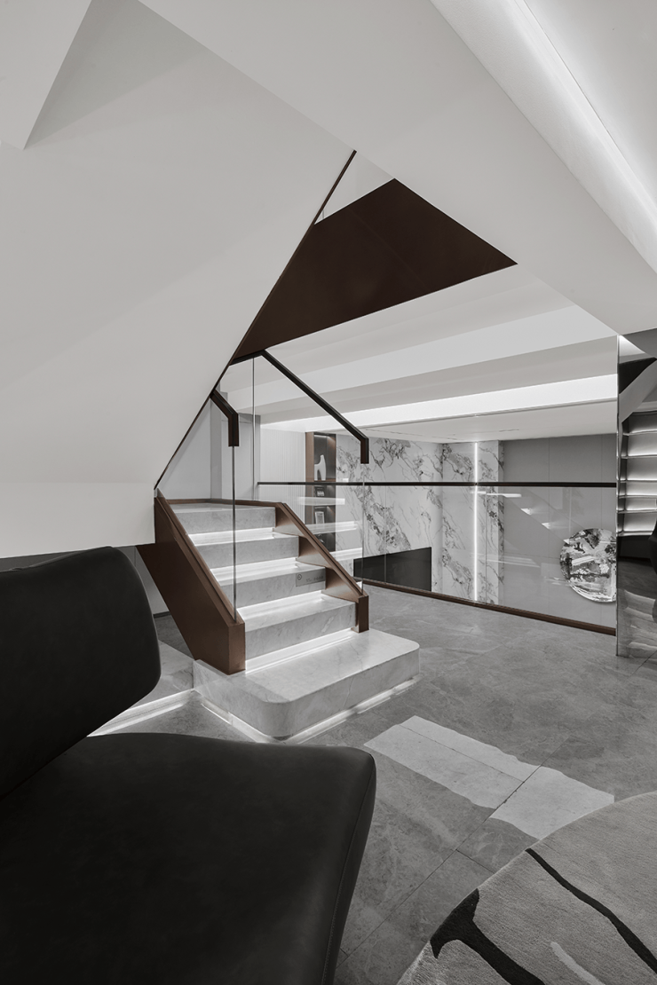 餐厅 厨房与楼梯间,设立了开放的中岛台,形成视觉隔断,在增添功能性的同时,也流露出设计师严谨的美学思考,以及对空间节奏的把控!沿梯下行楼梯利用灯光,呈现出轻盈的悬浮感,夹层作为阅读空间延续了整体色调,在黑白之中求得平衡 不张扬 也不喧闹,弧形沙发和圆形茶几带来的包围感!