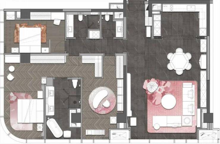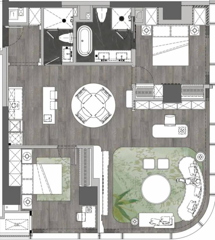 A1户型居其—戴昆设计,完美结合成都竹文化,通过将“竹”的诸多意象表达,与墙面、花艺、灯具、摆件等融合,进行艺术再造超越160㎡的空间尺度体验性感套房,50㎡时尚派对厅
