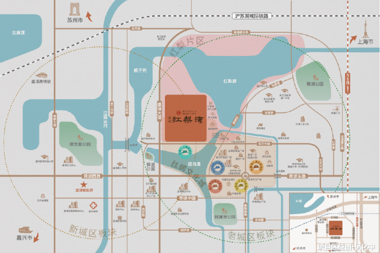 片区位置:盛泽大道与东方大街交汇地带,北依红梨湖(今桥北荡),南临西白漾,盛泽“一心两轴多片区”城市规划重要组成。