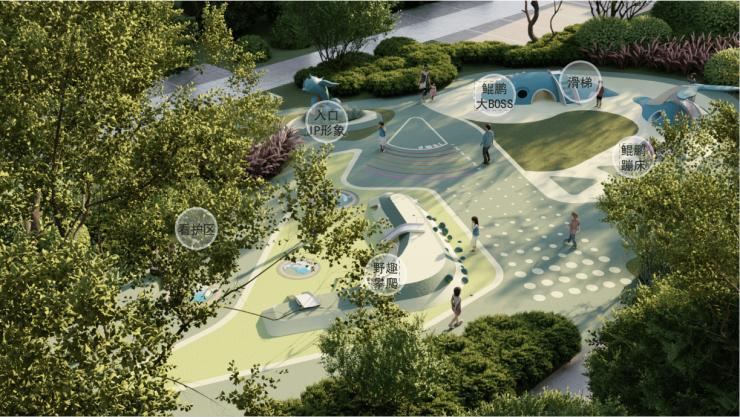 约500㎡儿童主题游戏区(鲲鹏乐园);成人运动区(轻氧健身倚鲲台、约450m有氧步道);长者花园(林屿间),全龄关照的活力生活场