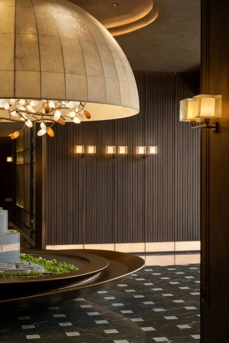 The black and white marble mosaic on the ground is a modern translation of the traditional "gold brick flooring". The semi-circular artistic chandelier is like a frozen ancient tree in Jiangnan, with metal branches adorned with lamps. It resembles the stars falling on the branches on a spring night in Jiangnan, evoking the splendor of "thousands of trees blooming on the east wind night", but also adding a leisurely feeling of "leisurely watching flowers bloom and fall in front of the courtyard". The central area's sand table is presented in a metal arc shape, like a flat boat carrying the vision of an "ideal residence", outlining the image of "water flowing through Jiangnan" in the space.