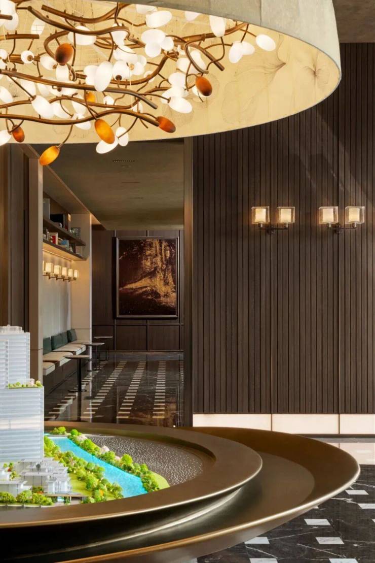 地面黑白相间的大理石拼花,是对传统“金砖铺地”的现代转译。半圆形艺术吊灯如江南古树凝固空中,金属枝桠缀灯盏,似江南春夜的星辰落满枝头,不禁想起“东风夜放花千树”的绚烂,却又多了份“闲看庭前花开花落”的悠然,中央区域的沙盘以金属弧形轮廓呈现,似一叶扁舟载着“理想居所”的愿景,在空间中勾勒出“水行江南”的意象。