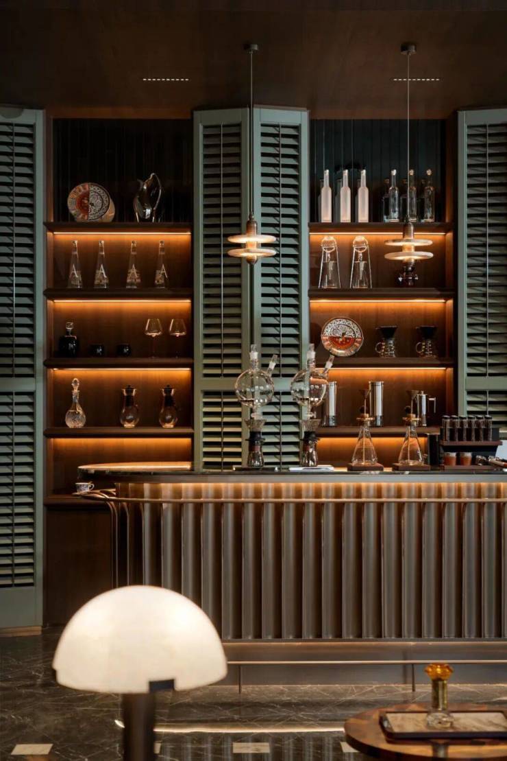 水吧区墨绿色大理石台面与金属线条的碰撞,复古绿百叶与暖光层架的呼应,将“东方雅致”与“现代精致”揉成一杯可品的“海派特调”。它既承载着岁月沉淀的厚重,亦跃动着海派美学的缱绻,和对江南生活最深情的告白,让访客在品鉴空间时,也能品鉴一份江南式的悠然。