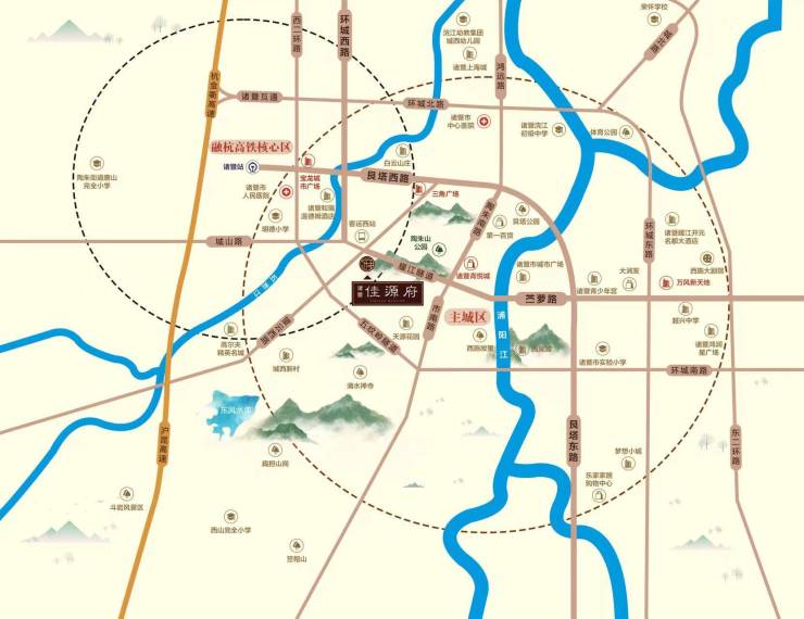 一脉诸暨城市交通主轴——苎萝路,无缝接驳主城;经环城西路接轨诸暨高铁站、沪昆高速、诸永高速等多维交通路网,出行便捷。快速融杭时代,将实现“20分钟+”高铁圈,半小时高速圈。