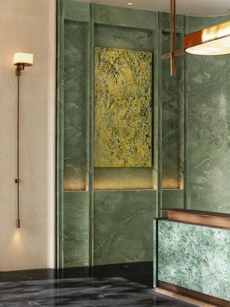 项目公区大量采用各种昂贵石材,以高端酒店的标准定制与打造。比如主入口大堂,是带有青绿色纹理, 名为只此青绿的奢石 ,地面用的是 太古黑金奢石 ,高奢的调性一下子显现出来。