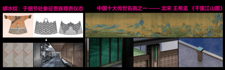 项目各处细节采用蟒水纹凸显尊贵,择取中国传世名画北宋王希孟的《千里江山图》中的青绿之韵原色,点缀在公区的软硬装材质中,更彰显东方传承意韵之美。