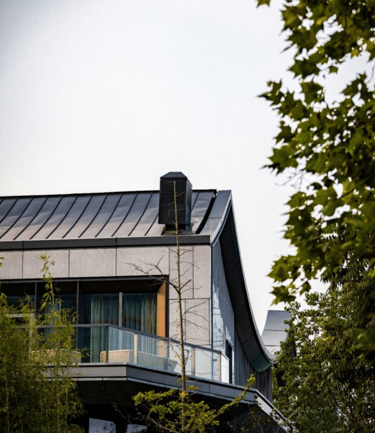 L型设计布局,270°宽景环绕,场景丰富,最大限度保留了室内的空间尺度。大面积玻璃立面,将群山古树“四季的变化”引入室内,不远外,是西溪的留白浓疏景色。