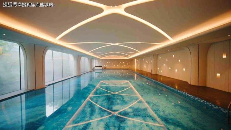 约500㎡艺术馆般泳池,天花、墙面以现代摩登的手法,抽取上海海派建筑造型为元素,打造充满静奢韵律的造型,搭配泳道尽端景泰蓝奢石背景墙,勾勒出一处臻享静美的精神之所。