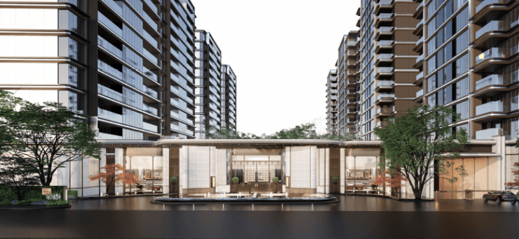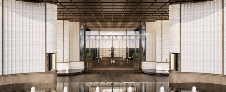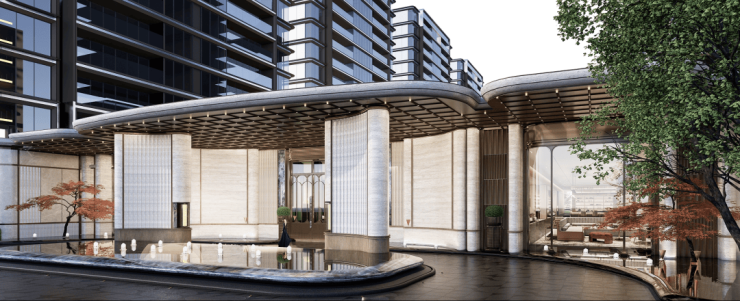 安玥的主入口,灵感来源于迈阿密1428塔楼公寓,将石面切割做出了丝绸感,建筑立面温润艺术,这就是十足的仪式感。