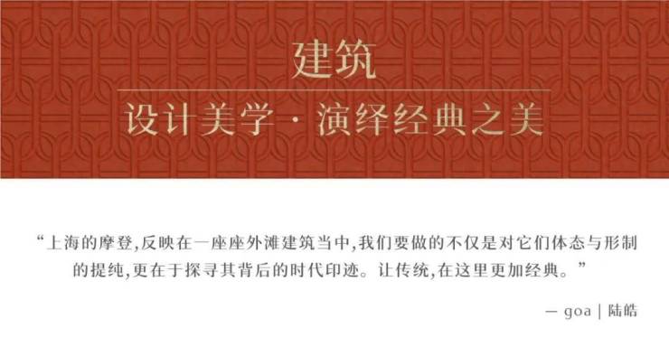 汲取外滩风貌建筑精髓——折衷主义风格,辅以现代化比例与线条勾勒,最终形成富有 ART DECO美学的建筑封面,令历久弥新的质感形成与万国建筑群的美妙对景。