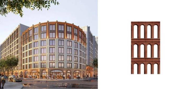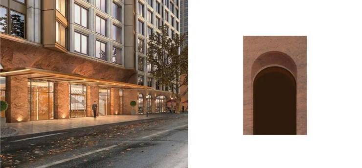 提取上海和平饭店、洛克·外滩源等经典建筑肌理,以"连续罗马券"的建筑基座,在保留开阔门楣尺度的同时,减轻古典建筑的厚重感,使建筑底座与体身充满磅礴的美学张力。