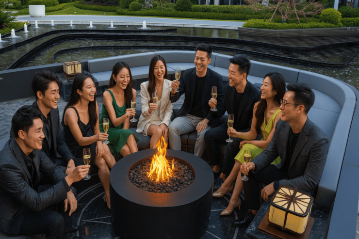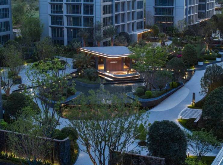 园区内别有洞天,约7000方贝尔高林的度假园林景观,花池树阵,涌泉跌水,下沉式中央水景做了一艘游艇式的舞台,燃起篝火,开启音乐,就可以来一场欢愉的鸡尾酒会。景观曲径通幽、卵石铺地,喷泉水柱清透凌空,如丝带般交织飞舞,加纳利海枣在阳光下熠熠生辉。