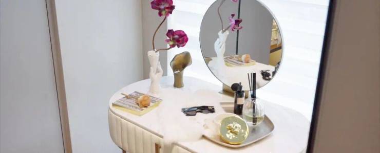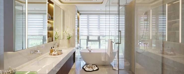 主卧则整整有(建筑面积约)50㎡,窗边一几二椅,看三山四季入画。卫浴用的是高仪,新加坡金沙酒店和阿布扎比皇宫的御用。梳妆台也有惊喜,面对自然采光,女孩子化妆也会更漂亮。