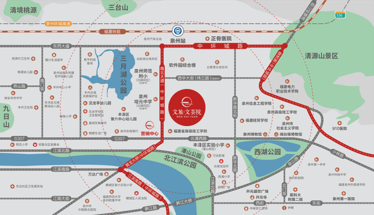 文旅·文荟院位于泉州市中心,与其它大社区项目不同的是,项目临近泉州古城,驾驶电动车15分钟即可抵达泉州开元寺、西街,不仅能轻松与泉州繁荣的烟火气紧密相连,且周边不远处有老泉州人习惯游览的清源山、西湖公园,离正在建设的“新西湖”也非常近。