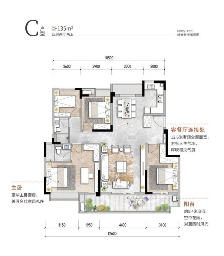 135㎡的四房两厅两卫,更大的主卧,星级的享受。该户型不仅有12.6米的奢阔全屋面宽,入户玄关、U型厨房、餐客厅一体设计、南北双阳台等身为一个优质户型的必要条件一个不少。户型亮点在于同时拥有约28㎡的星级总统套房式主卧与9.4米的超宽空中花园阳台,鱼与熊掌在此刻达到兼得。
