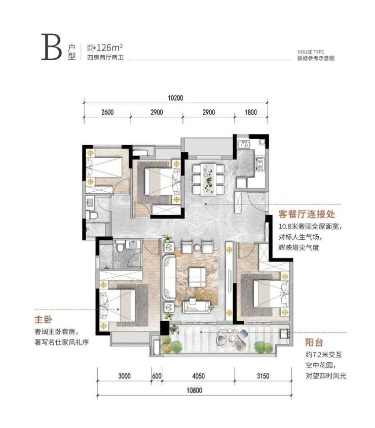 126㎡的四房两厅两卫,是有初步改善需求的优先选项。户型三开间朝南,户户南北通透,加上10.米的全屋面宽与7.2米的交互空中阳台,采光量与通透感加量,生活体验感再上台阶。套房式的主卧带飘窗搭配三次卧,更能满足二孩家庭需求。