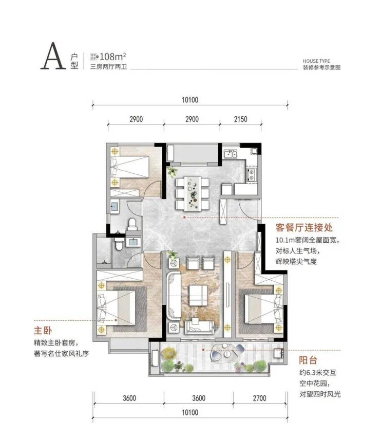 108㎡的三房两厅两卫,让人爱不释手的精致小户。但却突破性的实现南北通透,且拥有约9.9米的超宽全屋面宽的双阳台设计。户型规划餐客厅一体,加上6.3米的交互空中花园阳台,通透格局采光充分,在家中即可对望四时风光,精致又不失空间感。